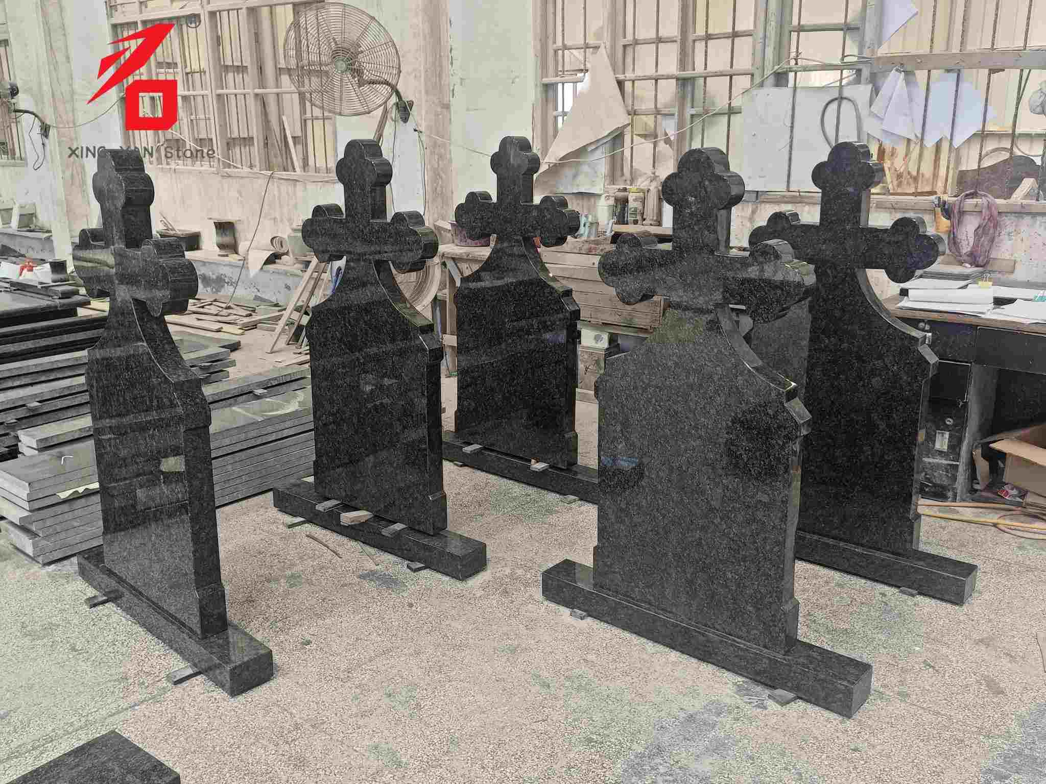 Materiale: Sort granit med høj densitet er valgt, med tætte og hårde stenegenskaber, vejrbestandig og erosionsbestandig. Overfladen gennemgår en fin poleringsbehandling, der giver høj glans og ensartet tekstur. Designet til langvarig udendørs placering, det modstår falmning og deformation, hvilket sikrer holdbarheden og den visuelle integritet af gravstenen.