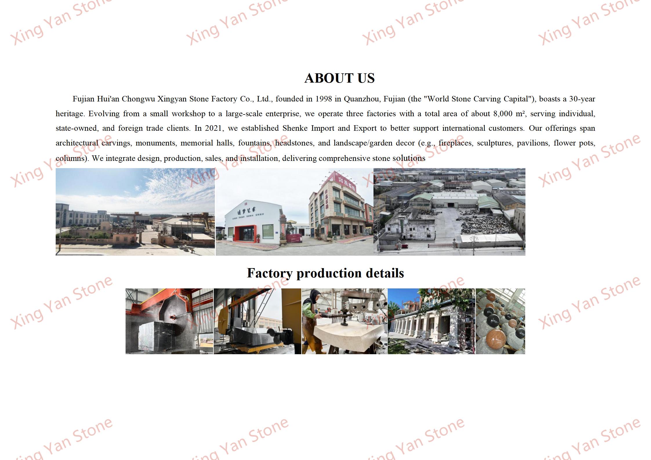 Materiale: Konstrueret af udvalgte flerfarvede granitstykker. Den hvide og rødbrune granit er hård og farvestabil. Efter polering har overfladen en høj glans og kan bevare sin form og farve i udendørs miljøer i lang tid.