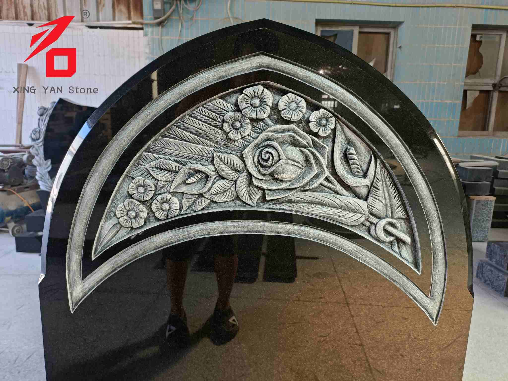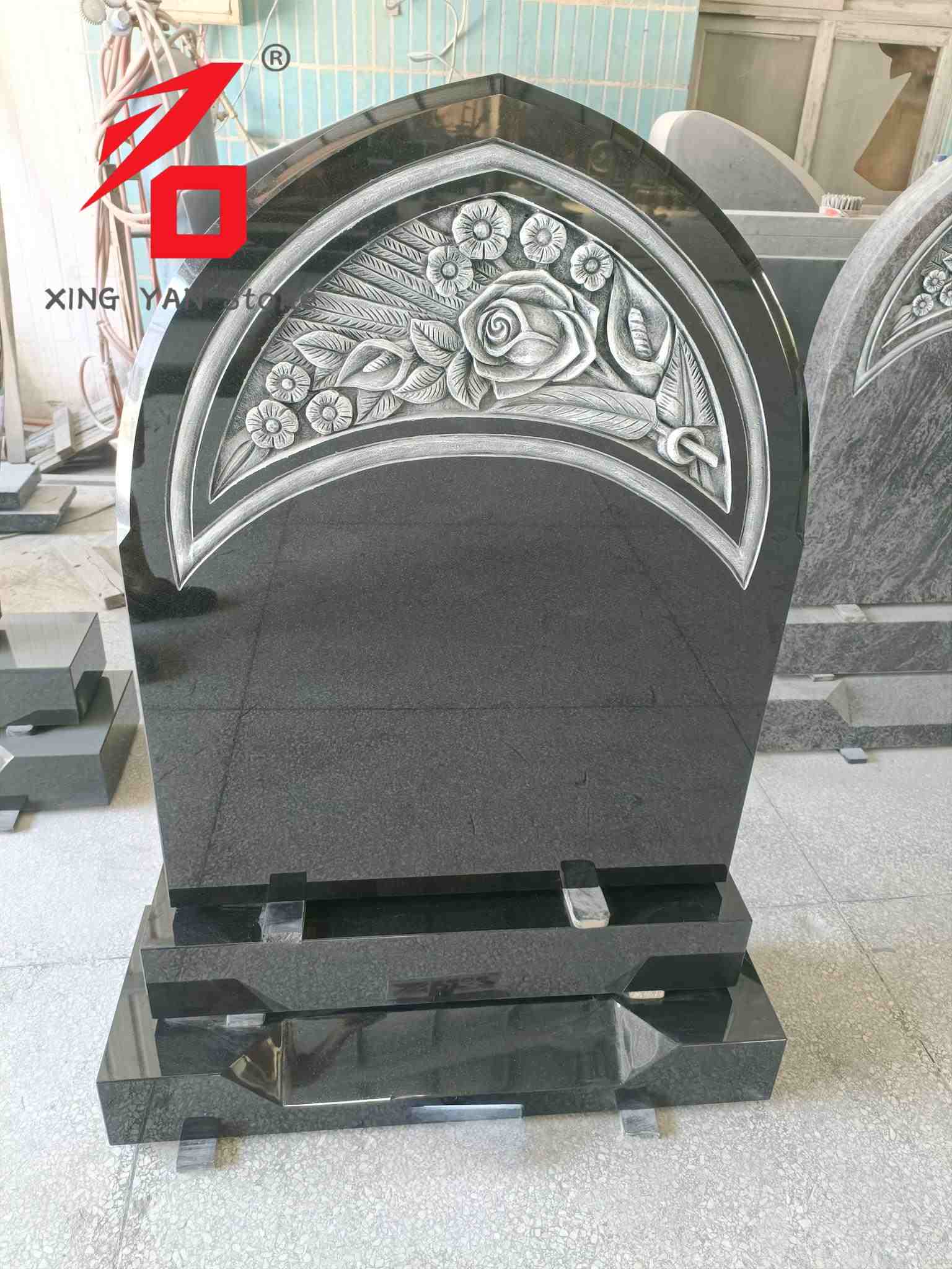Designstil: Den buede form parret med rosenreliefelementer formidler en mindeværdig betydning, der kombinerer blidhed og højtidelighed, velegnet til at udtrykke dyb erindring om den afdøde.